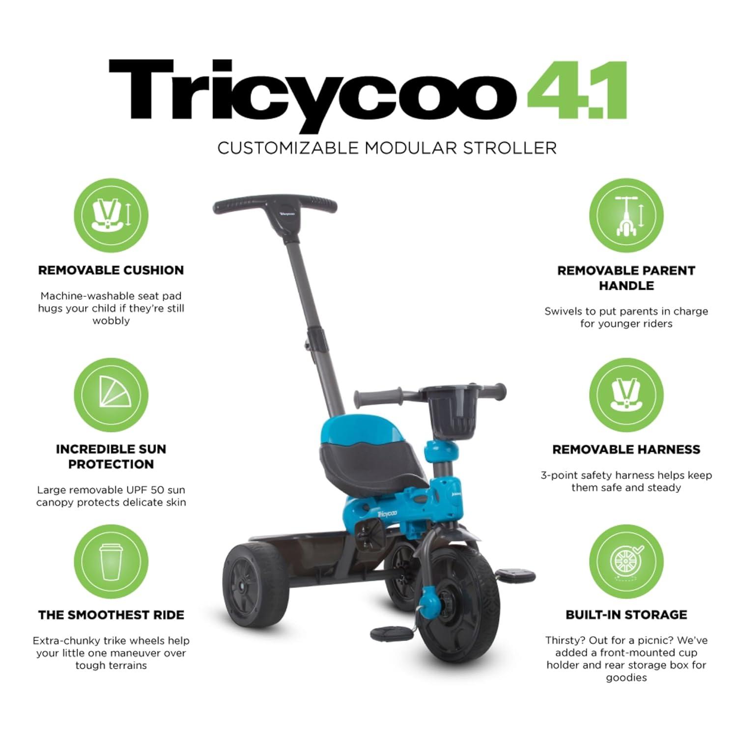Joovy Tricycoo 4.1 Kids Tricycle with 4-Stages Featuring Extra-Wide Front Tire, Removable and Adjustable Parent Handle, Safety Harness, Machine-Washable Seat Pad, and Retractable Canopy (Blue)(Blue)