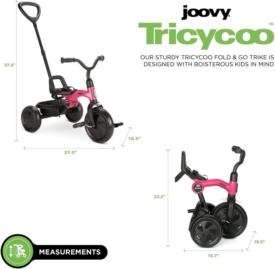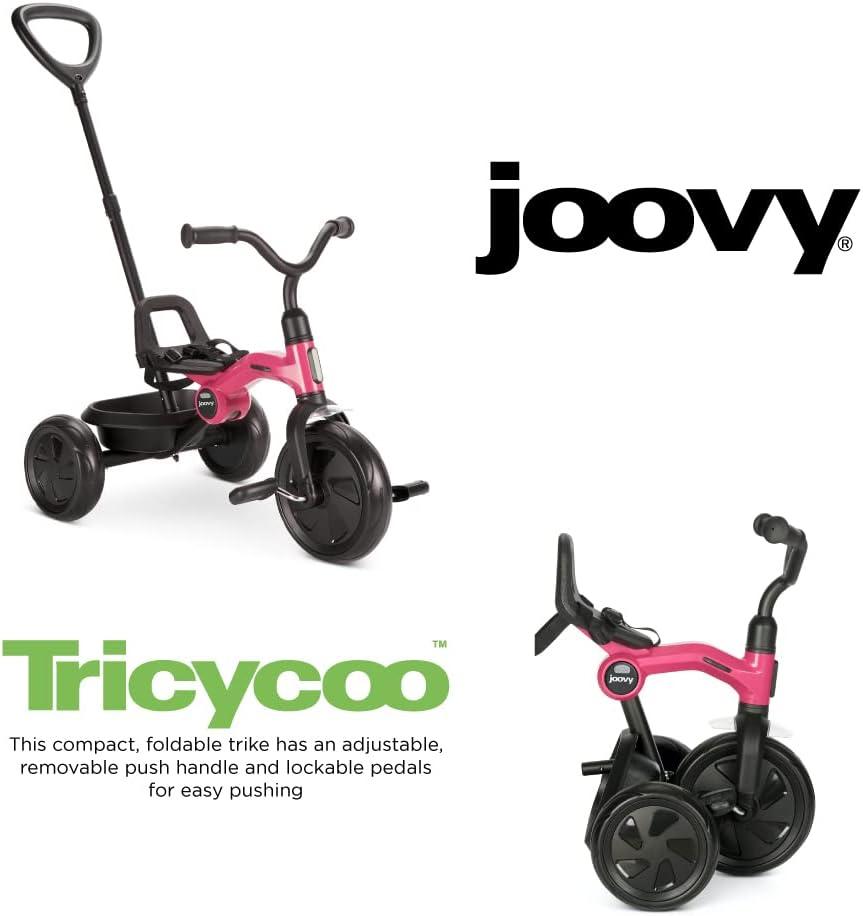 Joovy Tricycoo Fold & Go Toddler Tricycle Featuring Removable, Adjustable Push Handle, Lockable Front Pedals, Height-Adjustable Seat, 3-Point Safety Harness, and Rear Storage Box (Rorange), Large(Pink Crush)