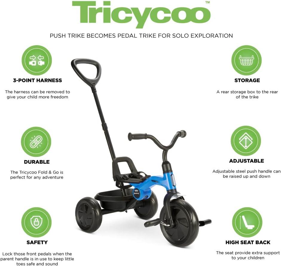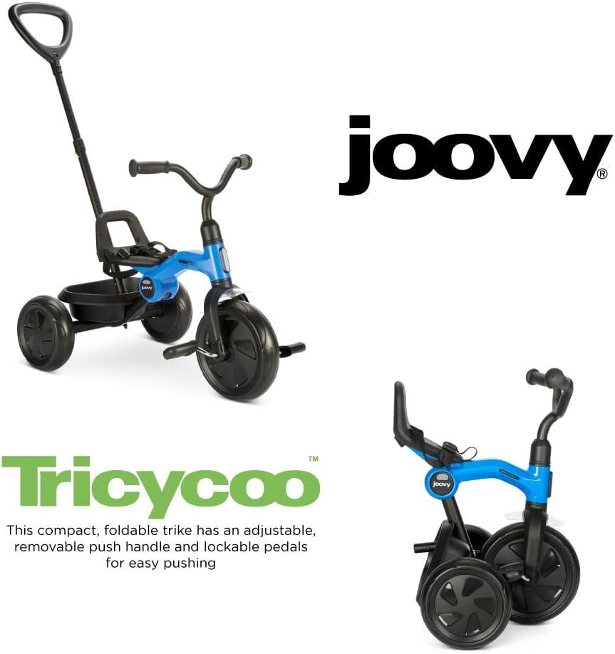 Joovy Tricycoo Fold & Go Toddler Tricycle Featuring Removable, Adjustable Push Handle, Lockable Front Pedals, Height-Adjustable Seat, 3-Point Safety Harness, and Rear Storage Box (Rorange), Large(Blueness)
