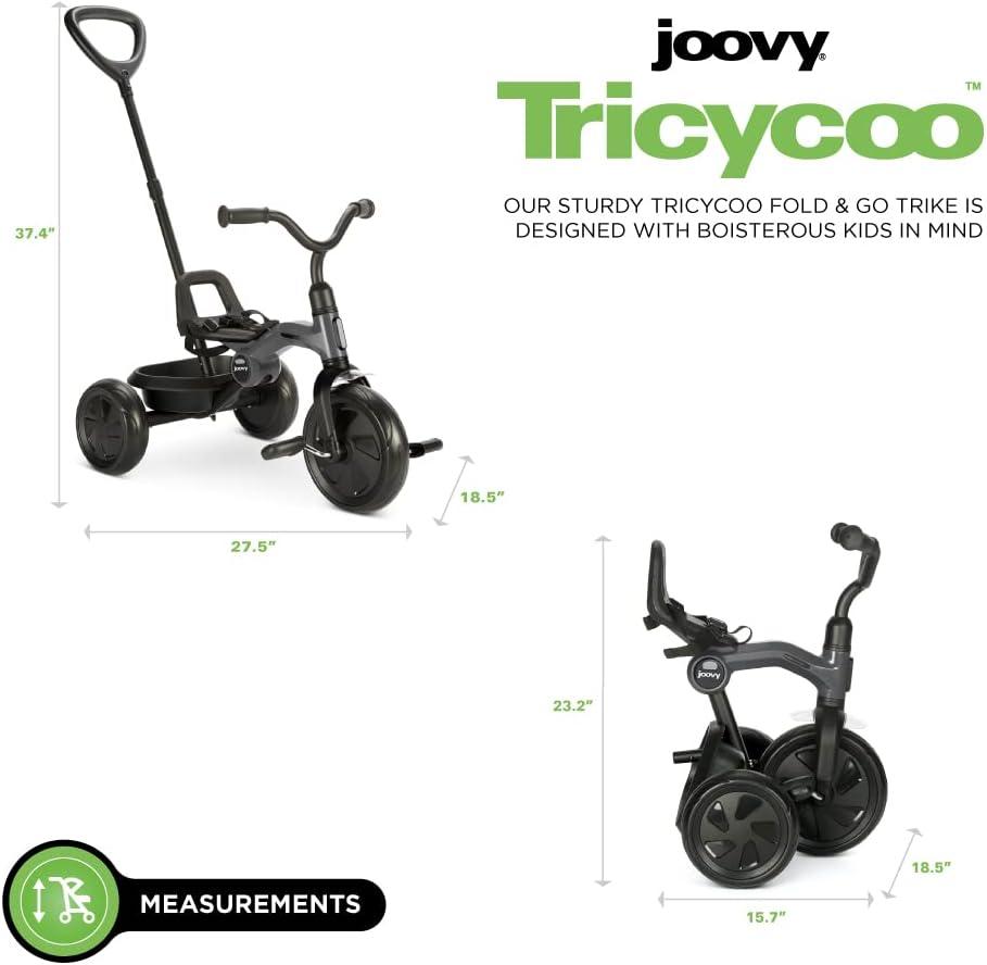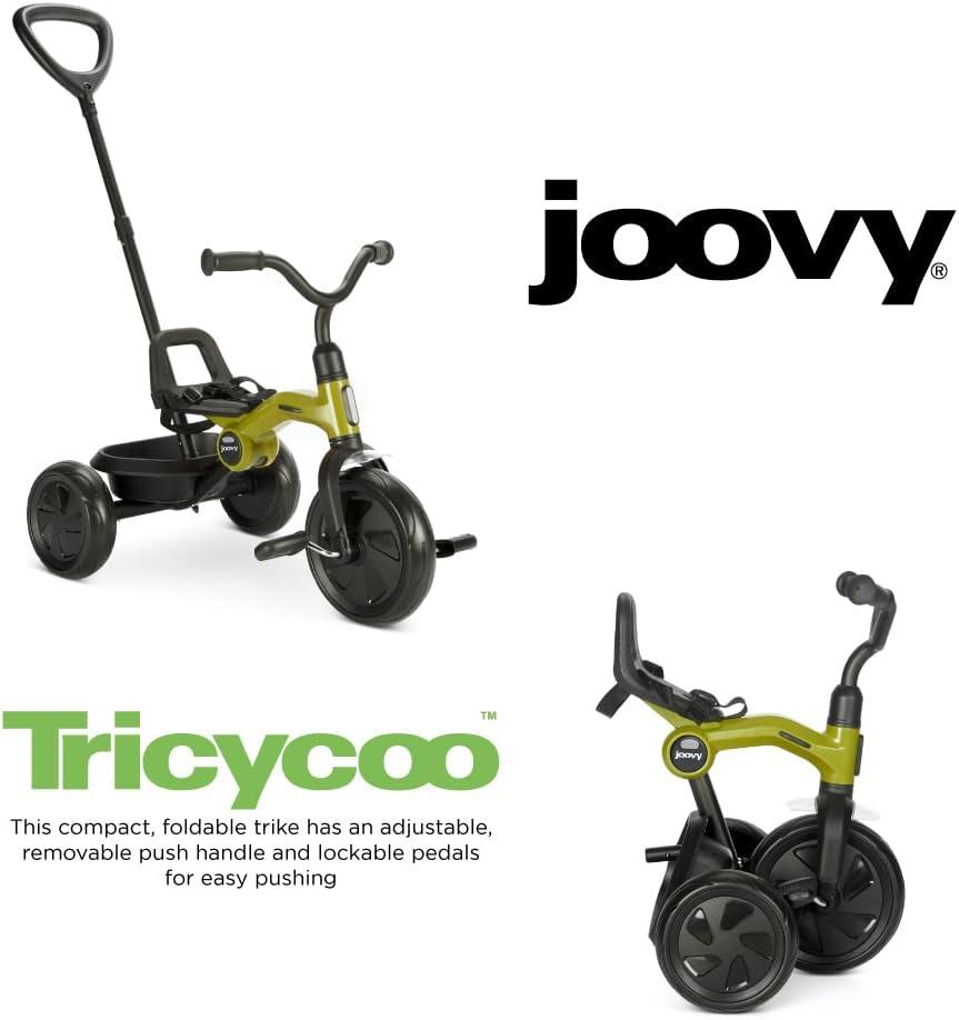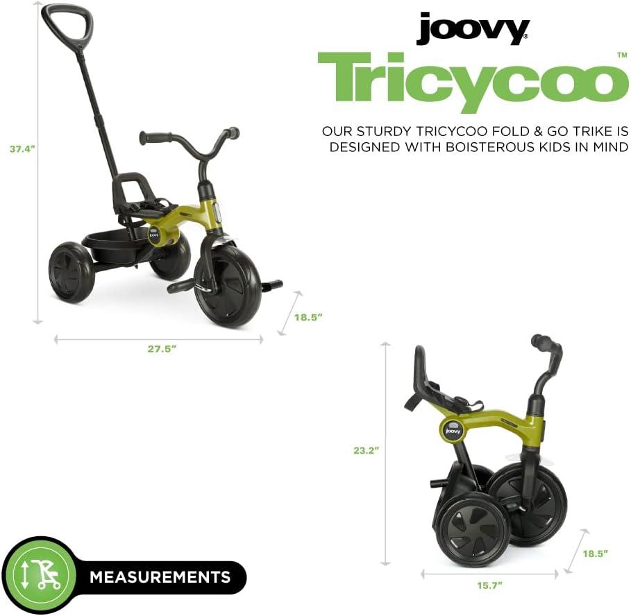 Joovy Tricycoo Fold & Go Toddler Tricycle Featuring Removable, Adjustable Push Handle, Lockable Front Pedals, Height-Adjustable Seat, 3-Point Safety Harness, and Rear Storage Box (Rorange), Large(Greenamole)