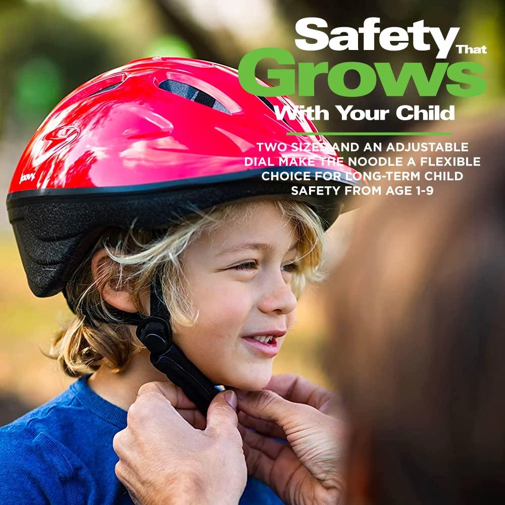 We feel that it's never too early to set a good example, especially when it comes to safety. At Joovy, we believe teaching children early about safety and creating good safety habits is an essential part of parenting. That's exactly why we developed the Noodle helmet. The Noodle helmet is for children with a head size between 18.5-20.5″ (47-52 cm)(Small Helmet) and 20.5-22 (52-56 cm)(Medium Helmet) . We recommend using it when children ride bikes, trikes, ride-on cars, scooters, bike trailers and other activities like these. The Joovy Noodle features 14 air vents, with integrated bug mesh in the front vents, extended visor for maximum protection, nylon straps, pinch guard chin strap, and an adjustable fit dial. It is a great looking helmet and comes in various colors. Meets CPSC Standards.